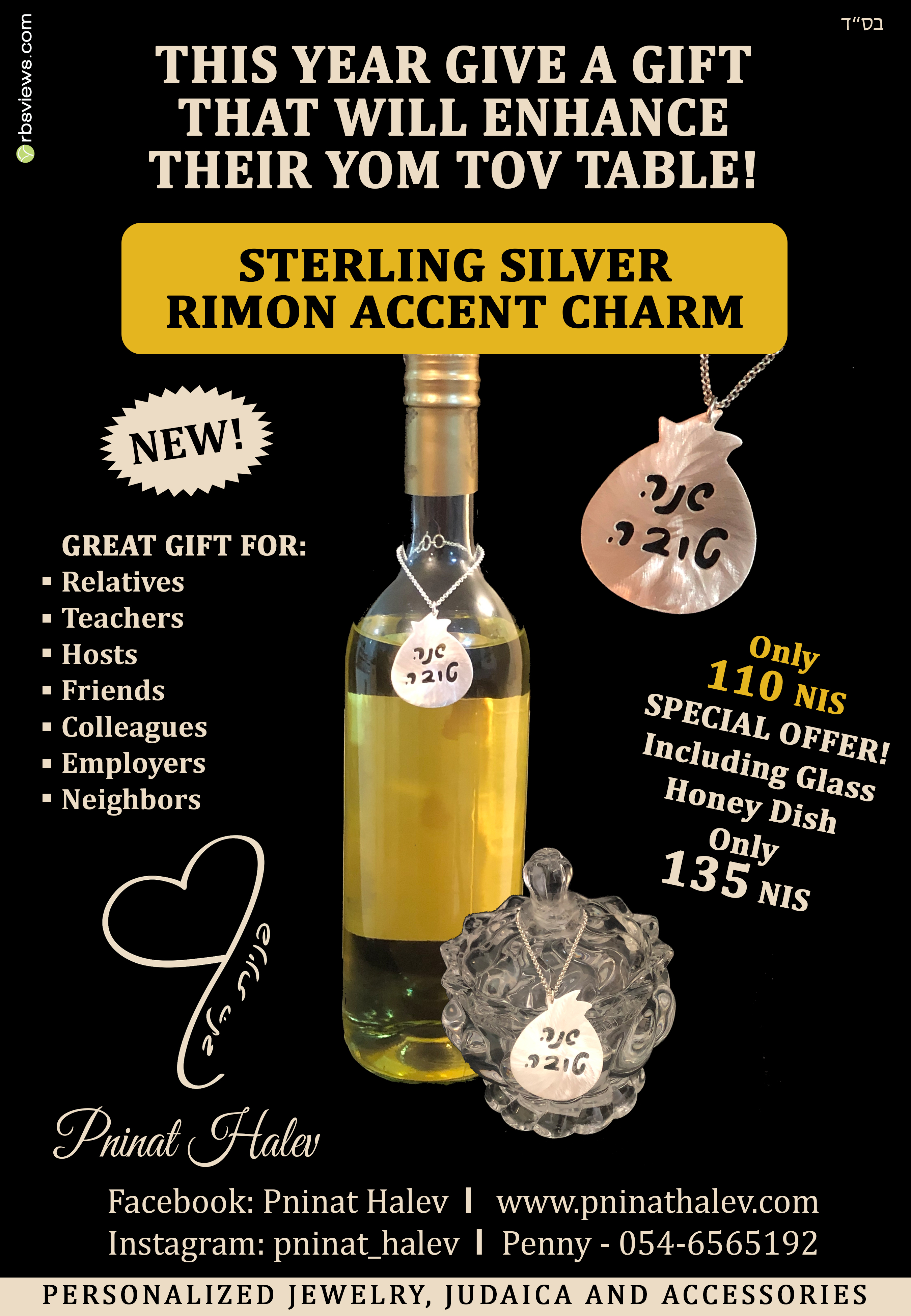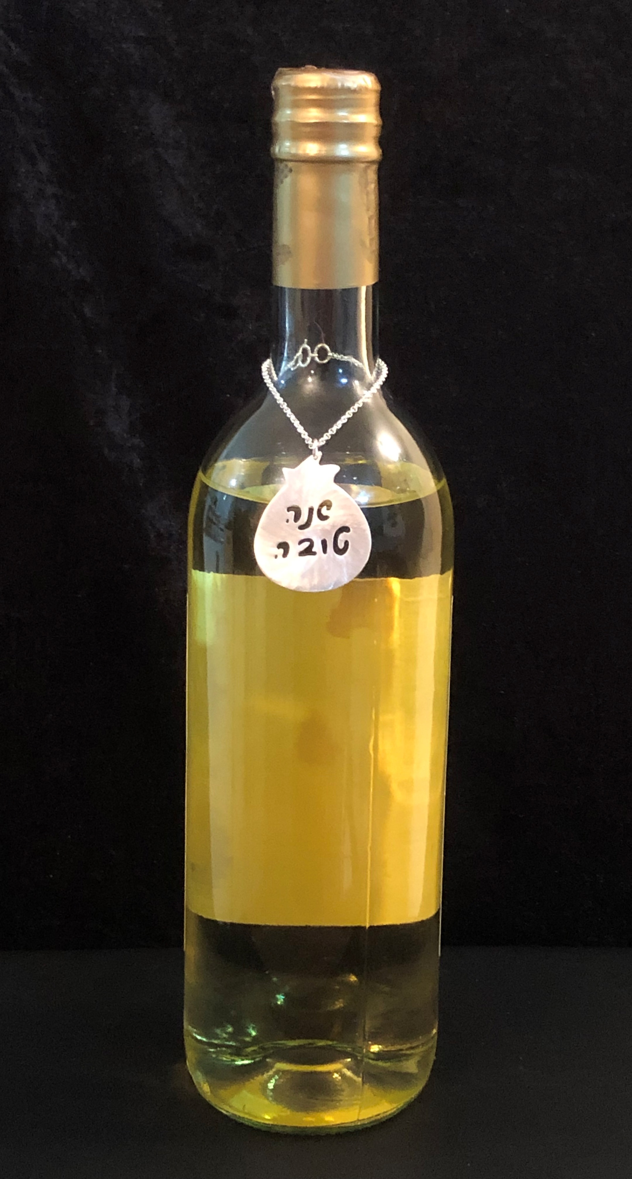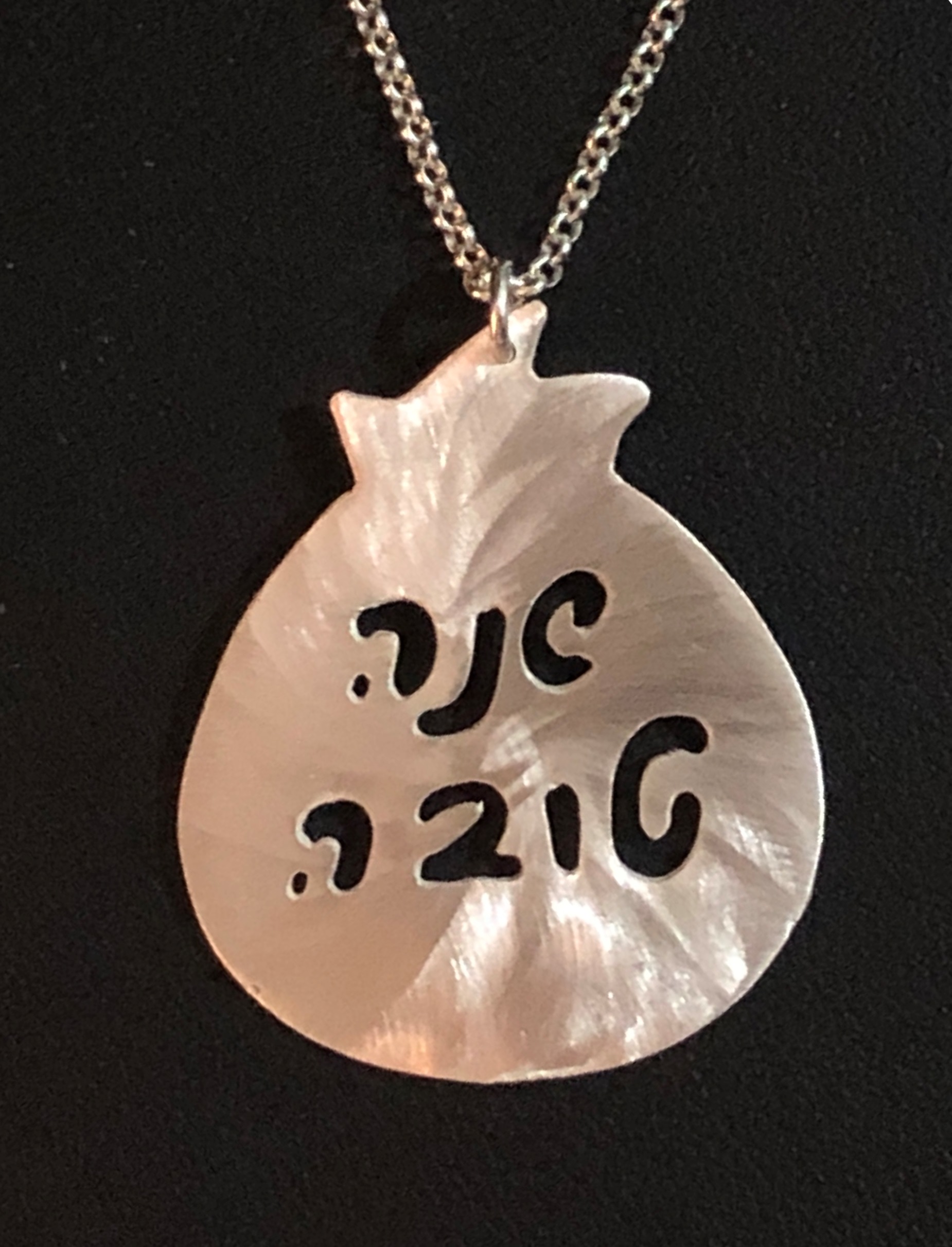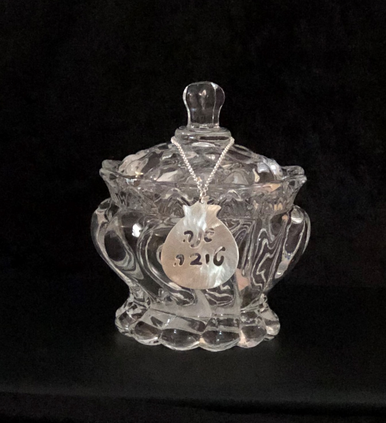 Sterling silver rimon charm with the Hebrew words “shana tova” pierced through the silver. Dangles from a sterling silver chain. Available alone or with a glass honey dish. (rimon size – ~3.6 cm, chain length ~13.9 cm)