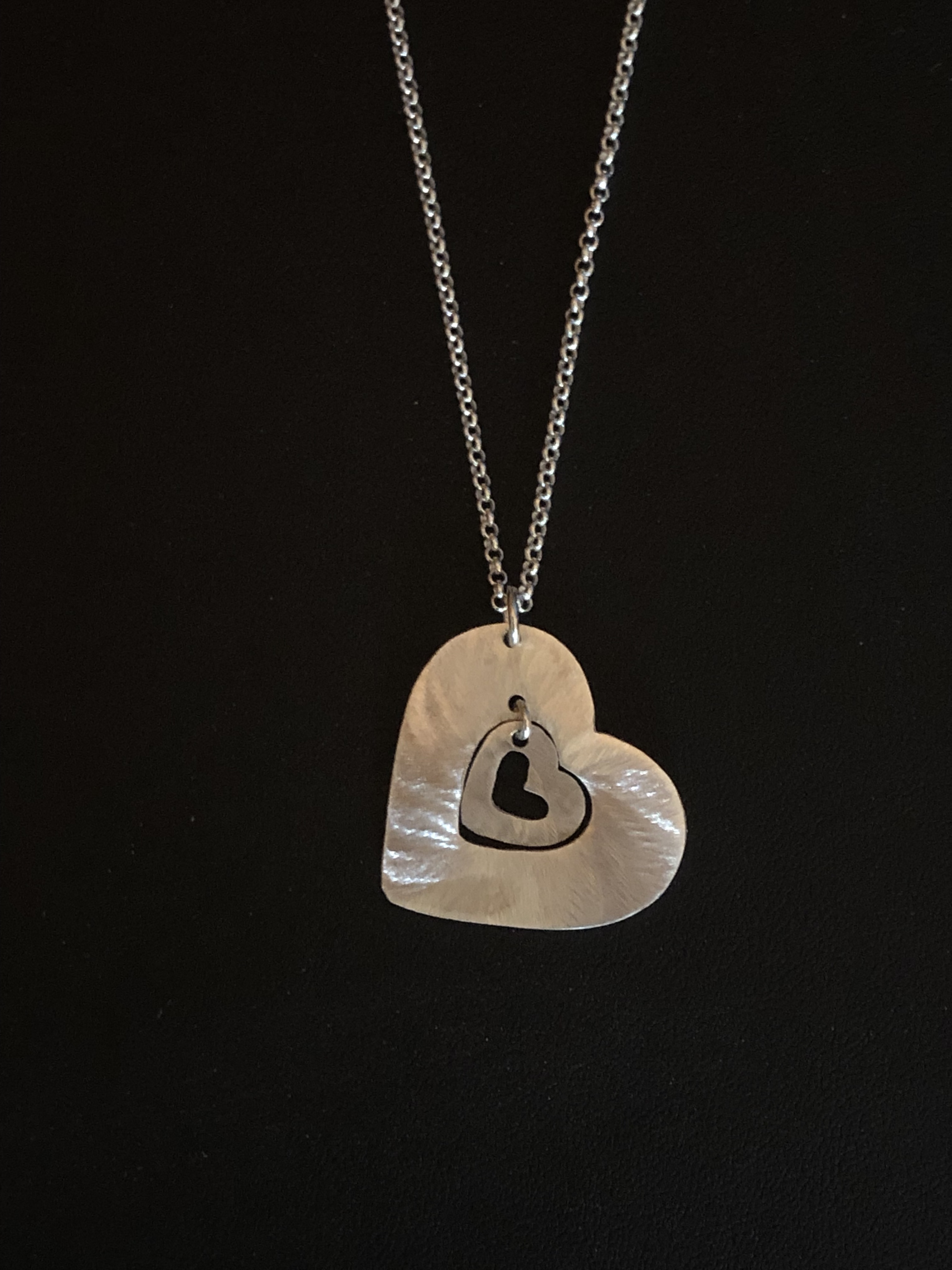 A tiny sterling silver heart dangles inside of a small sterling silver. Hangs on a sterling silver chain (~ 2.75 cm)